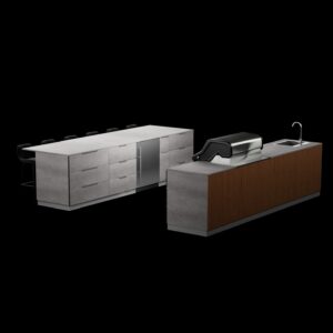 • Storage Cabinets (35.43 in / 90 cm): Includes 2 units, each featuring three soft-close drawers with a total storage capacity of 20.6 gallons per drawer. Polished stainless steel interiors with hidden handles. Full sintered stone cladding. Quantity: 2