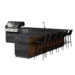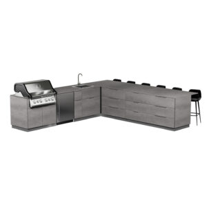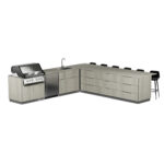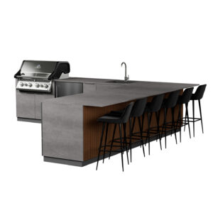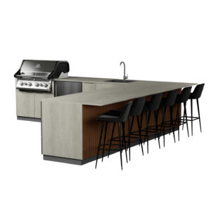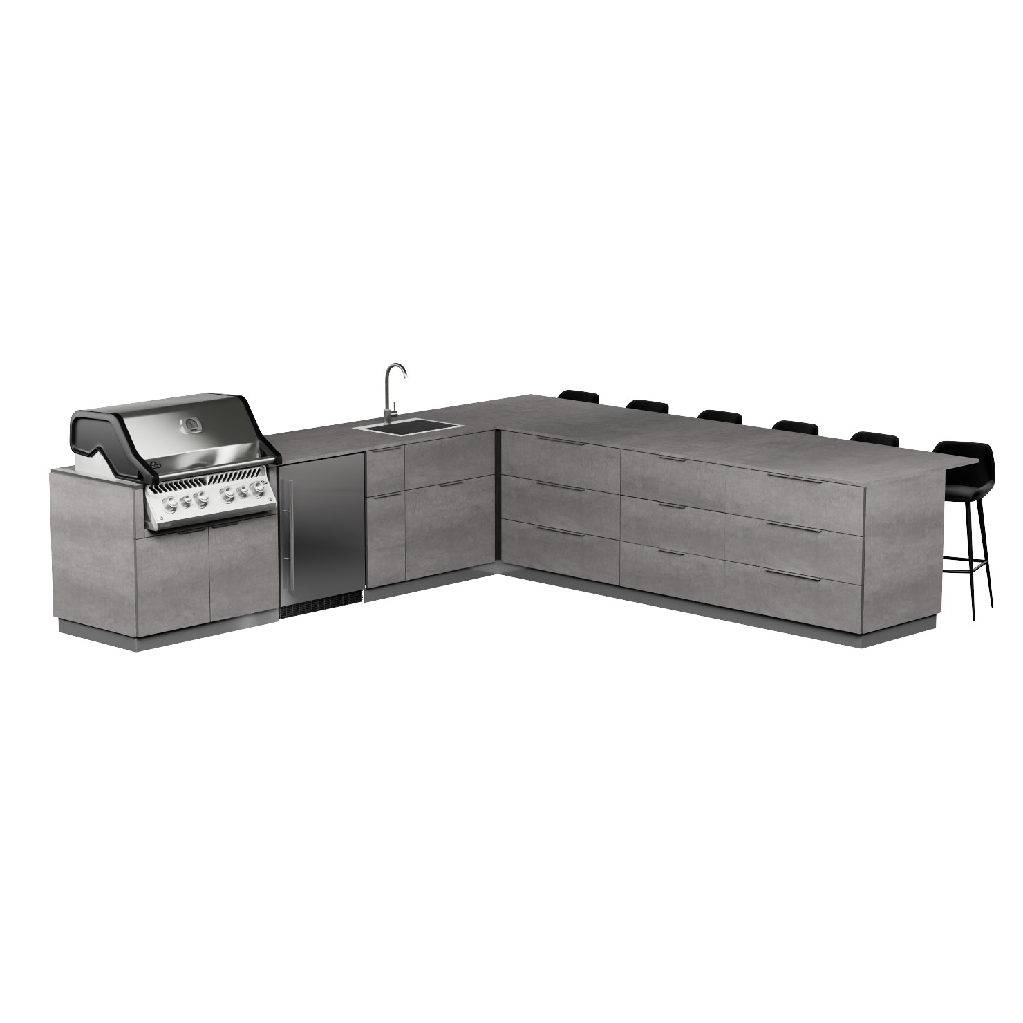 This 15.1 ft / 4.8 m L-shaped modular outdoor kitchen island is designed to enhance any outdoor space. Featuring a premium stainless-steel grill, a functional sink cabinet, ample storage, and a built-in outdoor refrigerator, it offers an elegant solution with unparalleled durability.